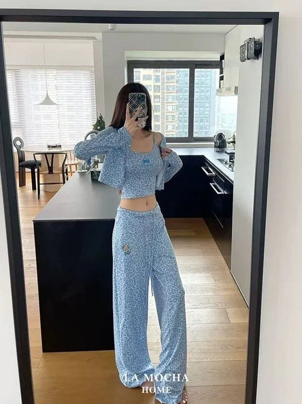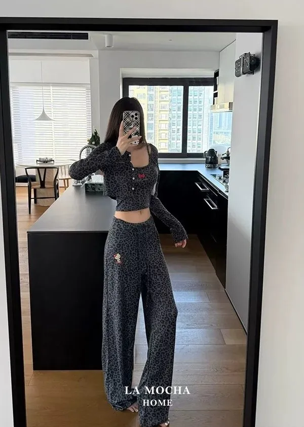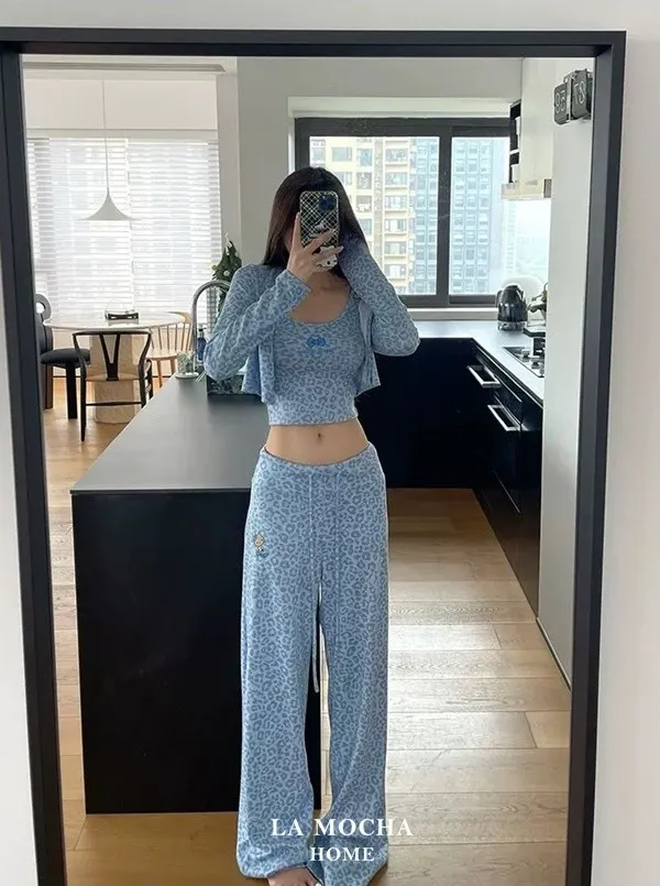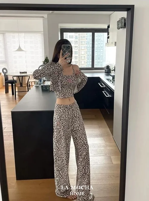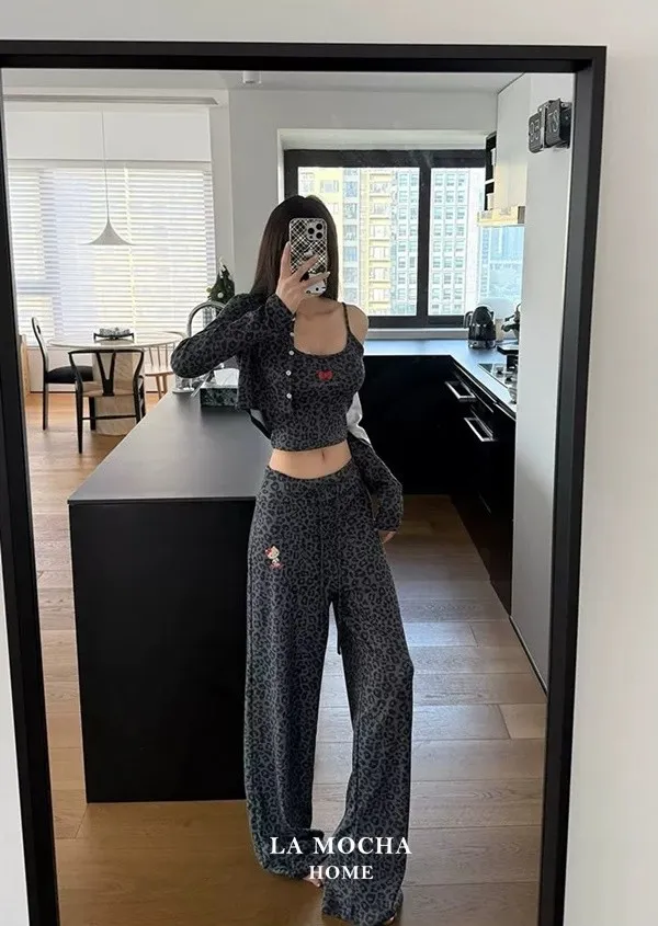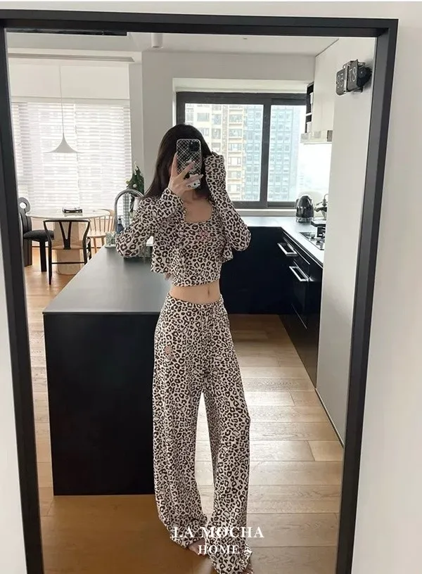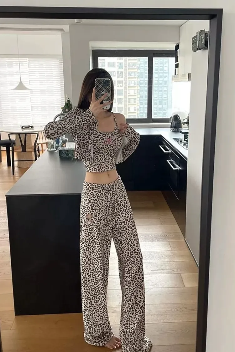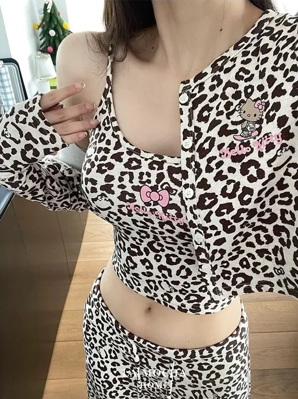 Kitty豹紋睡衣三件組(帶胸墊)